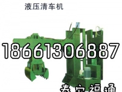液压清车机主要用于矿车底部粘黏物的挖掘清理工作。液压清车机采用悬壁结构,自带液压动力装置,可以实现铲板机构的升降和左右移动。铲板机构上装有两只油缸,铲板可以自动张开、挖掘、放料的过程动作,来实现对矿车厢底部物质的机械挖掘、清理。液压清车机的投入使用会大大的减轻了矿车清理工作的劳动强度,使矿车车底清理机械化,提高了效率,节省了设备占用空间,是矿车清理间的理想设备。